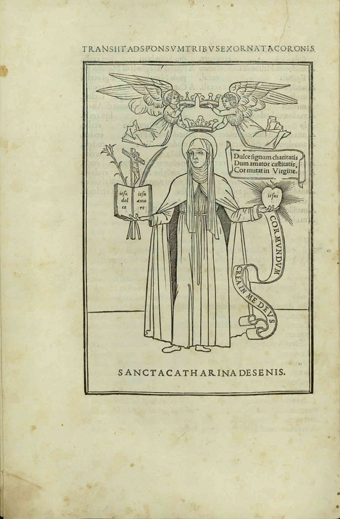 Enigmatica e grandissima Caterina. Vista dall’esterno, fuori dall’aura della sua santità canonica e dell’alta posizione di patrona d’Italia e d’Europa, appare ai nostri occhi di moderni ricca di contrasti difficili da comporre, spesso incomprensibili: una giovane donna incredibilmente tenace e determinata nell’opera che svolge in ambito pubblico (oggi diremmo politico), lucida e forte nelle sua idea di riforma religiosa che riprende con nuova forza molti motivi del dissenso cristiano e delle eresie, appassionata e inquieta nei pensieri e nella immaginazione, sofferente nel suo giovane corpo volontariamente e ostinatamente stremato dal digiuno[1].