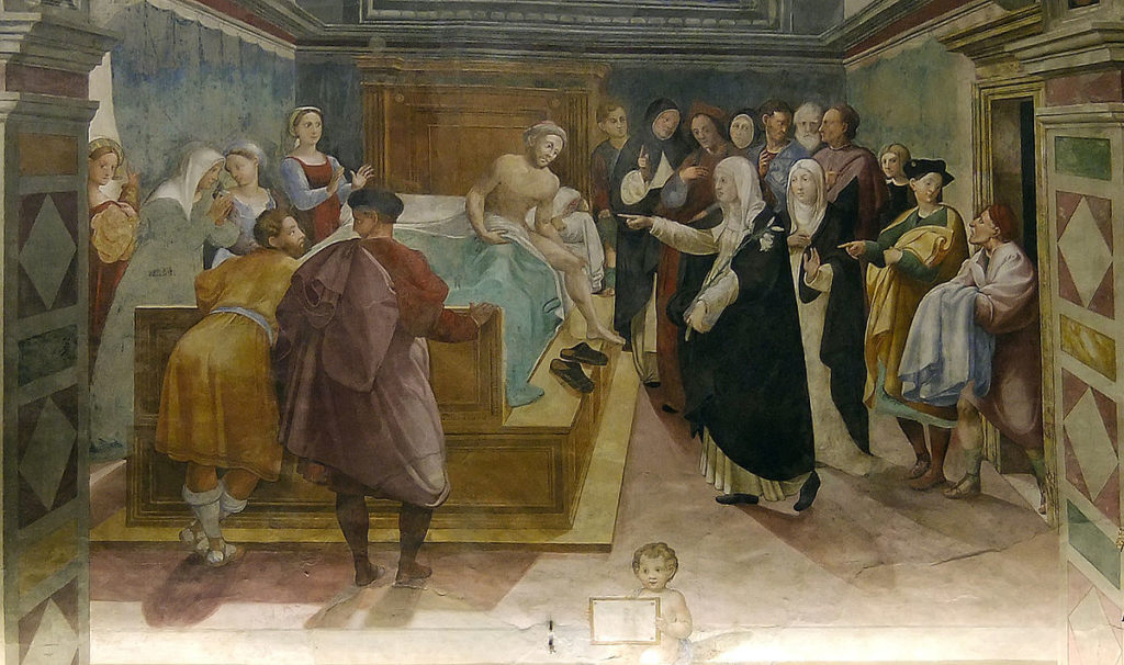 Caterina era nata in una famiglia numerosissima e modesta ma non povera, da Lapa e da Giacomo Benincasa nell’attuale contrada dell’Oca. Proprio in quell’anno (1347) erano apparsi in Europa i primi orrendi segni della peste che farà più di venti milioni di vittime. In Italia anche le fiorenti città della Toscana come Siena erano state contagiate dai viaggiatori provenienti da Venezia dove attraccavano le navi partite dai porti dell’Asia.