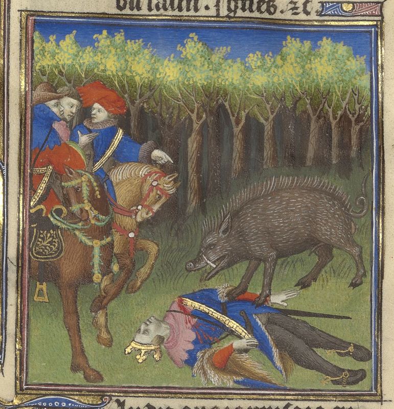La morte del re di Francia Filippo il Bello, ucciso da un cinghiale durante una battuta di caccia. La tempera con foglia d’oro su pergamena, opera del Maestro della Cité des Dames e della sua bottega (1412 c.) è conservata a Parigi, nella Bibliothèque de l’Arsenal