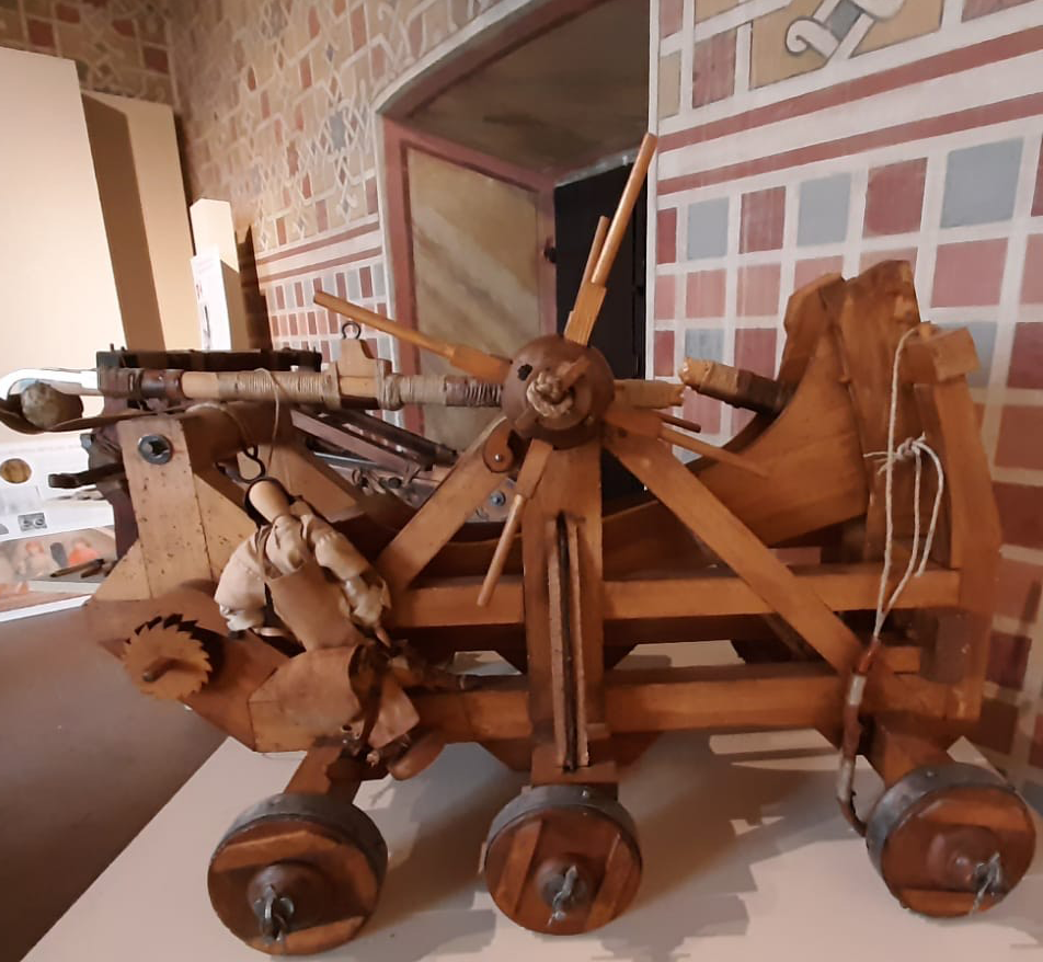 Il percorso prosegue in questa seconda sala con la descrizione delle armi bianche ossia di tutti quegli strumenti capaci di nuocere, ferire e uccidere per mezzo di punte, lame di metallo o forme contundenti. Erano distinte in armi corte (daghe, pugnali) e in armi lunghe o in asta (giavellotti, spiedi, lance) o ammanicate (mazze, scuri). Accanto alle armi bianche nei combattimenti e negli assedi si utilizzavano le macchine da guerra: molto difficili da spostare (per la loro mole) e da manovrare necessitavano di un personale molto addestrato. I modelli delle macchine esposti sono: la catapulta alla romana, l’onagro, il trabucco, lo scorpione, la scala ad elementi, l’ariete.